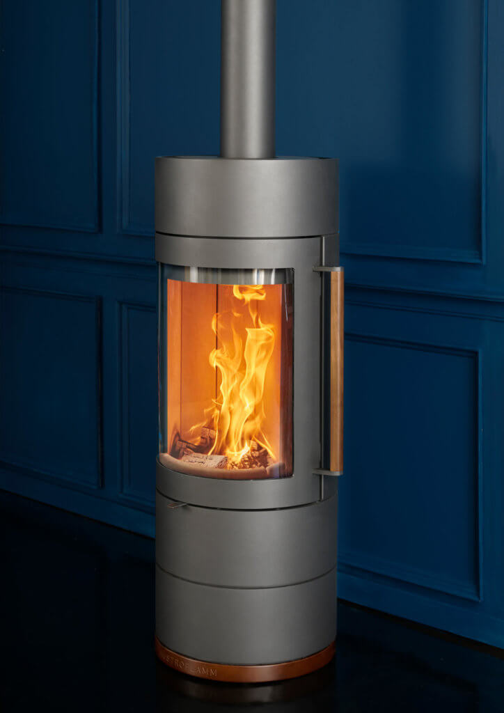 Mit zusätzlichem Sockel aus Holz lässt sich der Feuerraum anheben. Das Spiel der Flammen ist hinter der großzügigen Feuerraumtür gut zu beobachten.