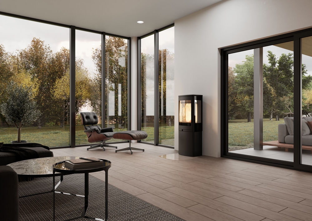 Der Nordpeis Kaminofen Duo 4 bietet freie Sicht auf das Feuer von drei Seiten.