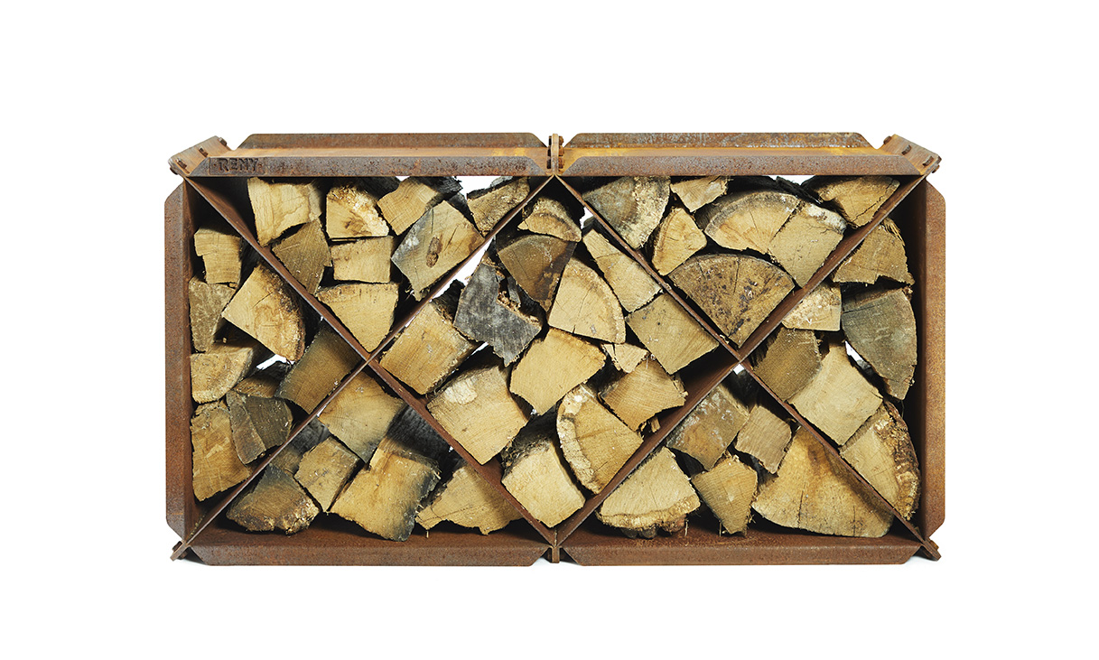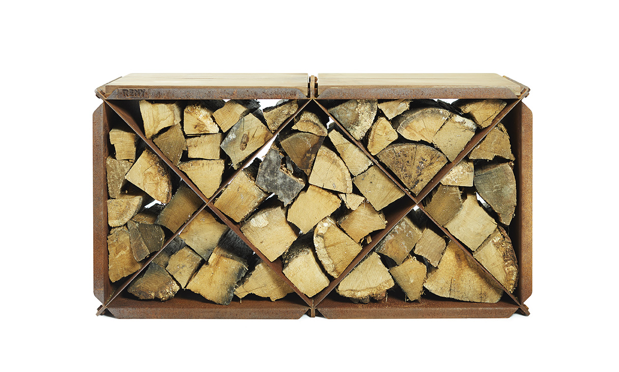 Kaminholzlege oder Hocker BloXX ist eine praktische Holzaufbewahrung von RB73. Hergestellt aus 2mm CorTen-Stahl.