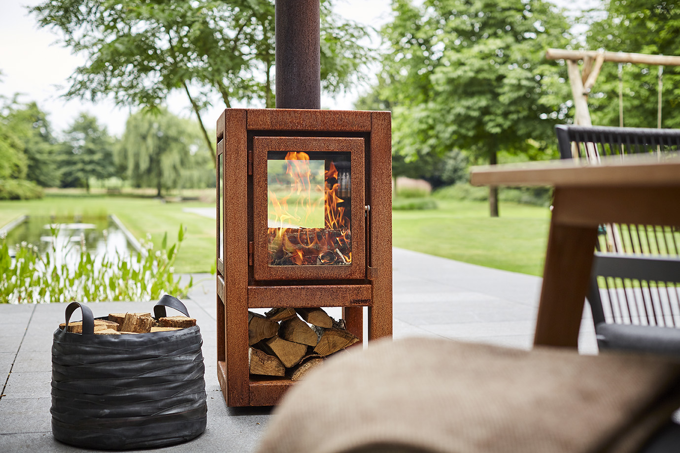 Die Kamine haben Glasfronten, so dass Sie nicht unter Rauch, Asche oder Funken auf der Terrasse. Der CorTen-Stahl verleiht den Kaminen ein solides Aussehen und eine lange Lebensdauer. Der Rostprozess ist bei jeder Feuerstelle anders und daher ist jede Feuerstelle einzigartig. Wie die Skandinavier sagen: "Keine Terrasse ohne ein Feuer .............."