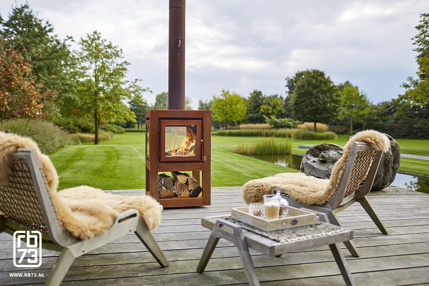 Die Kamine haben Glasfronten, so dass Sie nicht unter Rauch, Asche oder Funken auf der Terrasse. Der CorTen-Stahl verleiht den Kaminen ein solides Aussehen und eine lange Lebensdauer. Der Rostprozess ist bei jeder Feuerstelle anders und daher ist jede Feuerstelle einzigartig. Wie die Skandinavier sagen: "Keine Terrasse ohne ein Feuer .............."