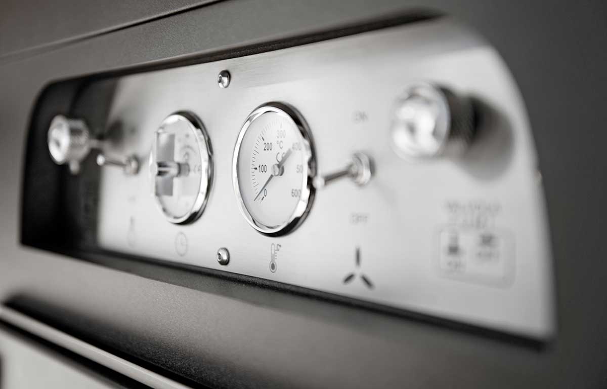 Präzises und exklusives Design: mit abgerundeten Türgläsern, die es einzigartig und exklusiv machen. Sogar die Schlitze in der Brennkammer geben ihre klassische Form auf, um eine neue Form im reinen "Flammen"-Stil anzunehmen. Ein Ofen, der durch seine Detailgenauigkeit angenehm überrascht, bis hin zu den Griffen, den Scharnieren und der Instrumentenkonsole.